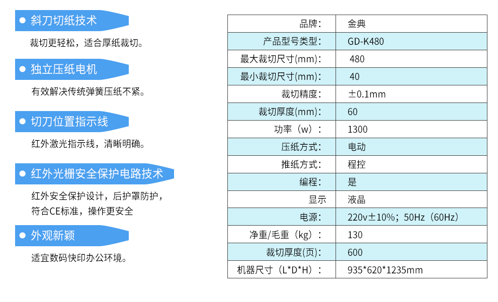 照片容量: 金典 操作方式: GD-K480 最大塑封厚度(mm): 60mm(600页) 输入电压(V): 电动 输入电流: 程控 预热时间: 支持 机器尺寸(mm): 数码显示 净重/毛重(kg): 220v±10% 过塑温度: 1300w 胶辊数量: 130/135kg 胶辊直径: 935×620×1235mm 输入功率(W): ±0.1mm 最大塑封尺寸(mm): 480mm 毛重(kg): 电动程控切纸机 净重(kg): 40mm