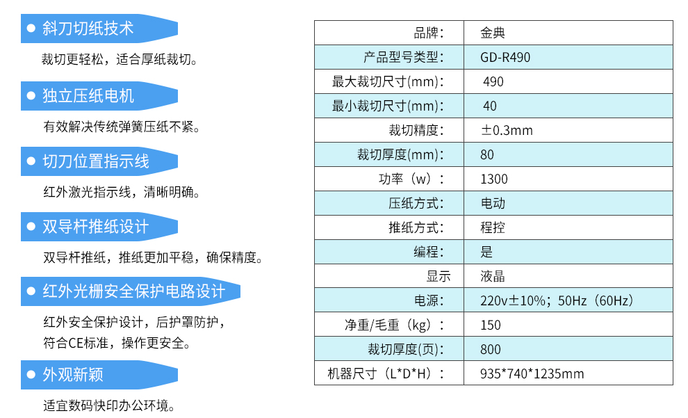 照片容量: 金典 操作方式: GD-R490 最大塑封尺寸(mm): 490mm 最大塑封厚度(mm): 80mm(800页) 输入功率(W): ±0.3mm 输入电压(V): 电动 输入电流: 程控 预热时间: 支持 机器尺寸(mm): 液晶显示 净重/毛重(kg): 220v±10% 过塑温度: 1400w 胶辊直径: 935×740×1235mm 胶辊数量: 150/190kg 过塑宽度: 950×750×1250mm 毛重(kg): 电动程控切纸机 净重(kg): 40mm