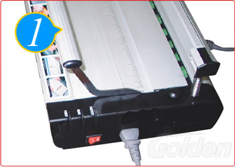 插上电源。打开电源开关,为了减少等待时间,让装订机提前预热。