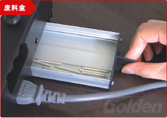 打开一侧便可倒出纸屑。装订机后部两侧也有废料盒盖板,打开一侧便可抽出废料盒,清除废针屑。
