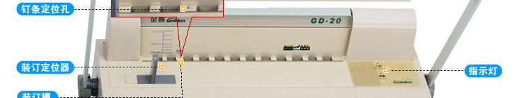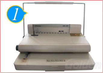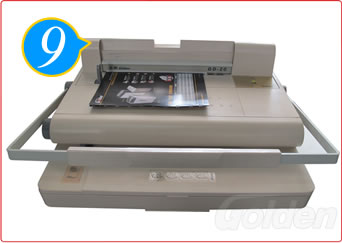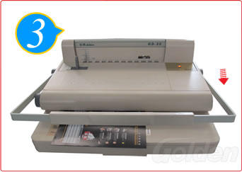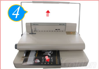 此时顺时针抬起手柄至最高位置,蜂鸣声停止,电源指示灯(红色)继续发光,拉起压条使之回到压条座内,电源指示灯(红色)灭,取出装订好的文本,机器回到初始状态。