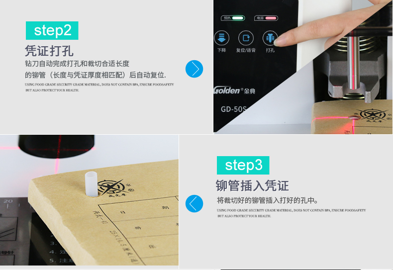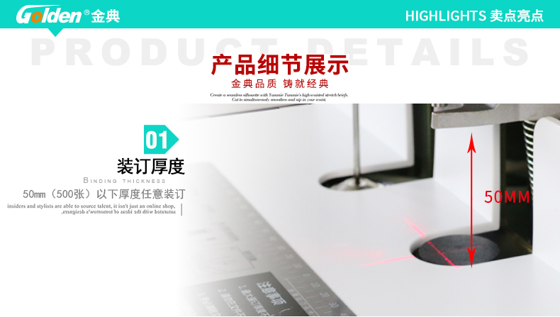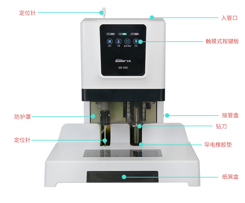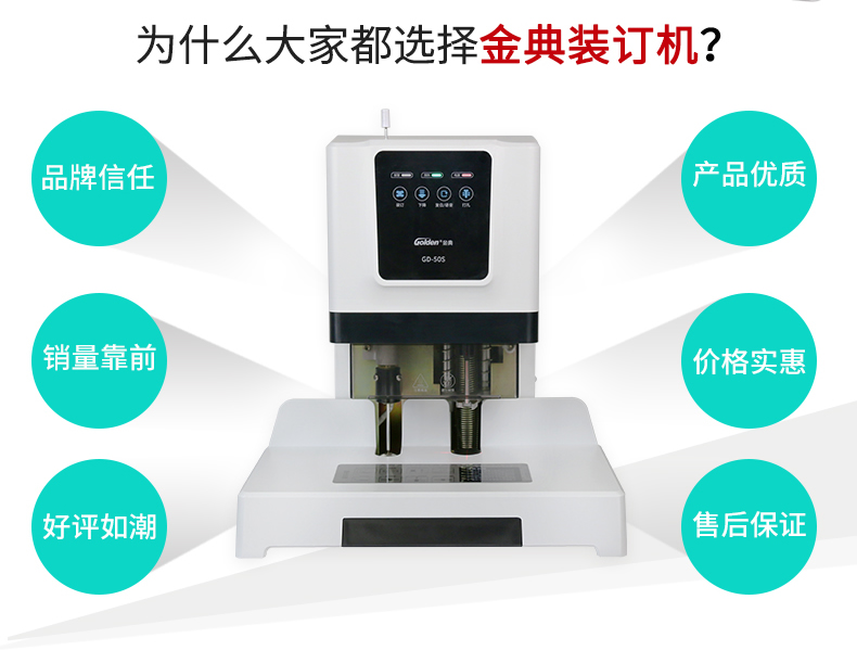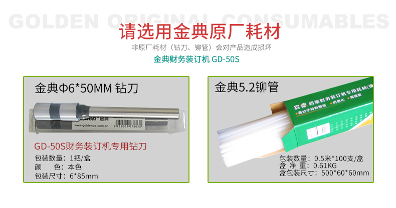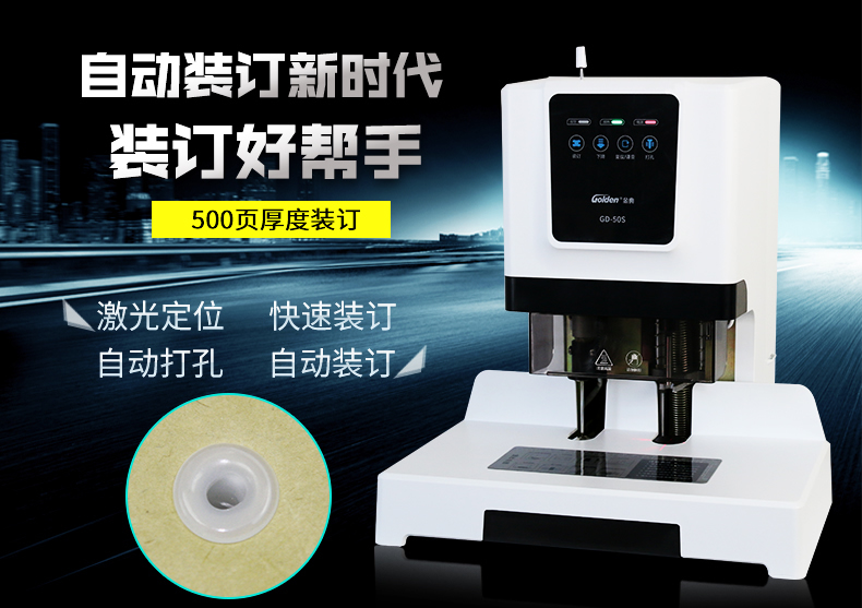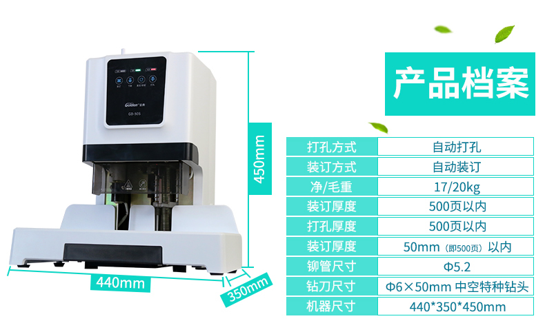 产品特性: GD-50S 匹配耗材: 自动 功率: 220v±5% / 50hz 装订方式: Φ6*50 可装订材料: Φ5.2 连续工作时间: 17/20 加上手柄的尺寸(mm): 410*208*136.5 毛重(kg): 500mm*335mm*566mm 产地: ≤2分钟 打孔方式: 160W 工作温度(℃): 480*375*518MM 机器净尺寸(mm): 1-50mm 外包装尺寸(mm): 自动