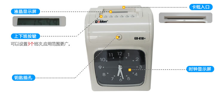 可以设置3个班次,应用范围更广;双时间显示,一个钟面 一个液晶显示。