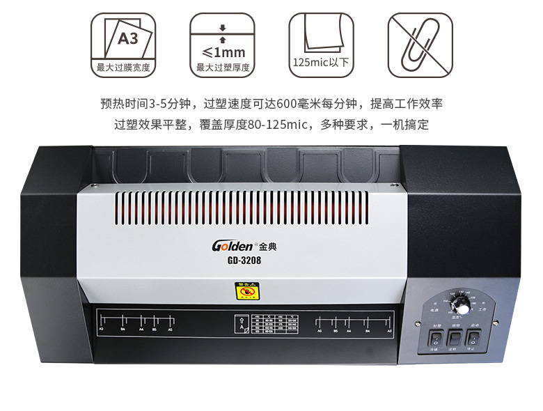 胶装厚度: 金典 铣刀方式: GD-3208 产地: 320mm 最大裁切尺寸(mm): ≦1mm 裁切厚度(mm): 320mm 前台面有效深度: 600mm/min 压纸方式: 3-5min 编程: 6.5/7KG 显示方式: 500*240*92mm 电源: 540*280*140mm 机器尺寸(H*D*W)(mm): AC220V /50Hz 包装尺寸(mm): 600W