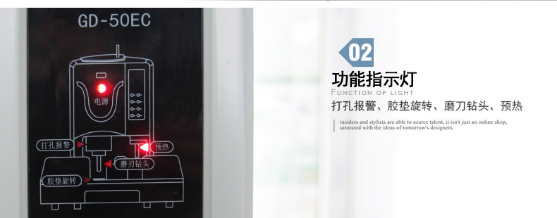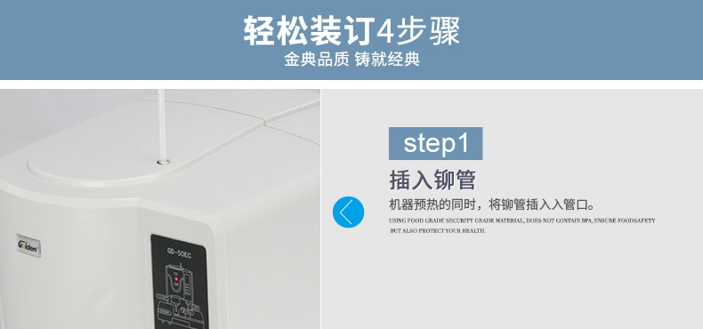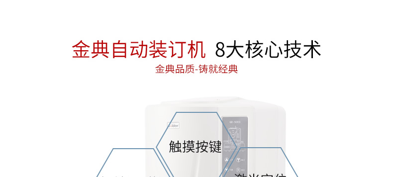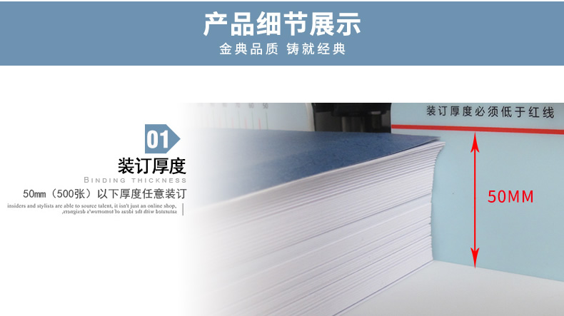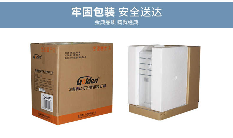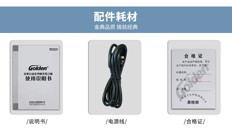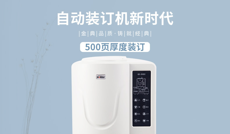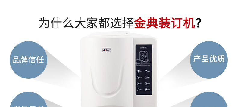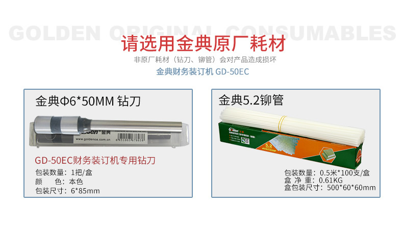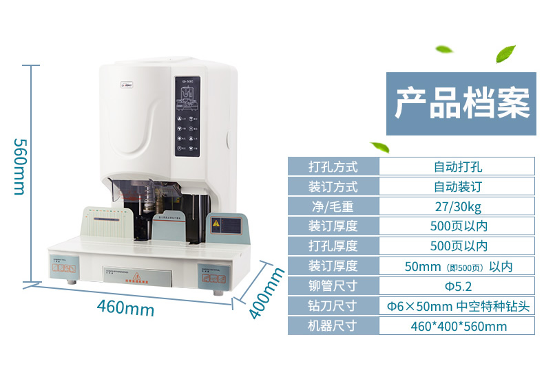 产品类型: 金典 产品特性: GD-50EC 匹配耗材: 自动 产地: 2-3分钟 最大装订尺寸(mm): ≤30秒 功率: 220v±5% / 50hz 打孔方式: 350w 装订方式: Φ6*50 可装订材料: Φ5.2 连续工作时间: 30/36kg 工作温度(℃): 400×460×560mm 加上手柄的尺寸(mm): 470×200mm 毛重(kg): 630×420×655mm 机器净尺寸(mm): 1-50mm 外包装尺寸(mm): 自动
