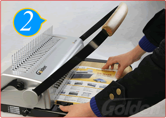 将手柄慢慢地往上推至拉圈打开,然后将纸张孔插入拉圈内,将手柄慢慢往回拉,让拉圈齿全部插进纸张孔后,将手柄拉到位,收紧拉圈口。