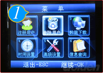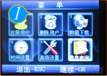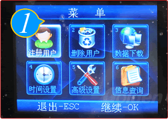 ”键,显示开机界面。按“MENU”键,进入主菜单页,选择“注册用户”进入。