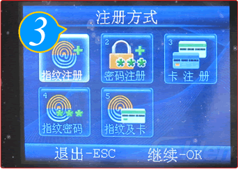 选择“新注册”按“OK”键进入“注册方式”,选择你想选择的几种方式,如:“指纹注册”,按“OK”键进入。