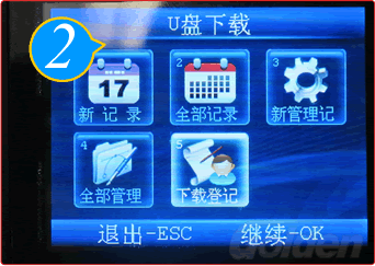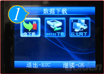 插入U盘,按“MENU”进入菜单页,选择“数据下载”进入下一界面,选择“U盘下载”,按“OK”键确认。