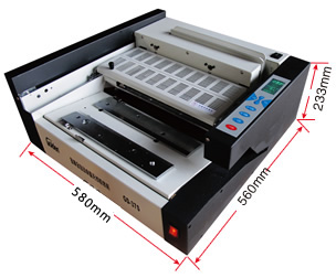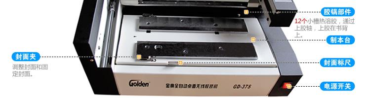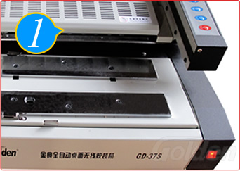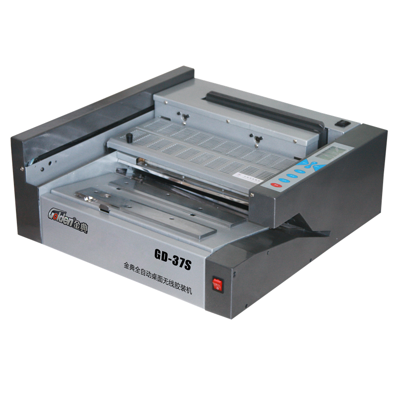 金典GD-37S桌面式无线胶装机采用微电脑控制:书本检测、书本夹紧检测、铣刀起动检测、胶辊旋转 夹面台上升等全部自动感应,放书时间、放封面时间、夹面压力等可任意设定,8项自检功能,故障代码显示、纠错等智能化设计,让您对爱机了如指掌安全保护让您后顾无忧。