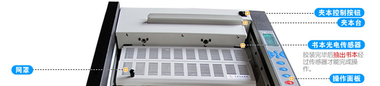 配有双路空气开关、漏电保护开关、高温烫手保护罩、紧停开关、各种安全保护提示。夹面高低可调专利技术:左、右夹面台高低可调,有效控制书背的方圆效果,同时能适应各种不同厚薄封面的调节要求。人性化设计,抽屉室集屑斗、简便的换胶结构设计,配有大容量胶盒,开放式封面平台设计,使放封面时更简单,更人性化。
