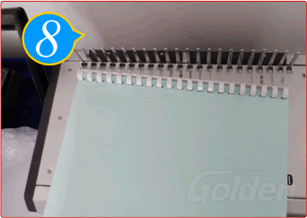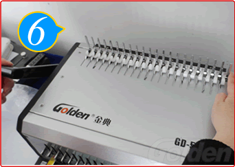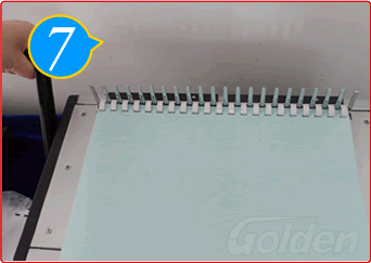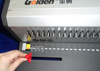 让纸张孔全部插进胶圈齿后,将手柄往上拉直到拉到位,收紧胶圈口。