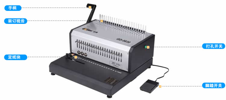 边距可调,三种规格边距( 3MM,6MM,9MM);电动打孔,区别于普通装订机手动打孔,关键:一键式轻松打孔,轻轻按下打孔开关按钮或脚踏开关进行打孔(两种方式任选一种打孔方式都可以,如下图);适用于:办公室、广告公司、印刷厂、文印装订商务社等。