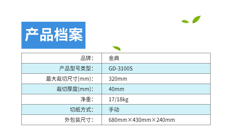 照片容量: 金典 操作方式: GD-3100S 最大塑封尺寸(mm): 320mm 最大塑封厚度(mm): 40mm(400页) 输入功率(W): ±1mm 输入电压(V): 手动 输入电流: 手动 预热时间: 不支持 机器尺寸(mm): 刻度标尺 胶辊数量: 17/18kg 过塑宽度: 680×430×240mm 毛重(kg): 桌面式切纸机