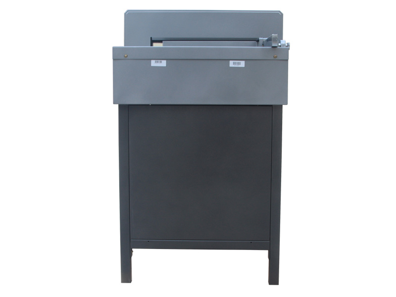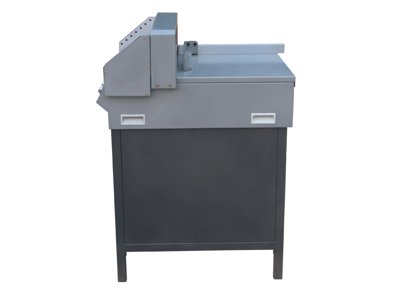 推入裁切纸张或书本,置于左边与标尺条靠齐,转动推纸手轮,调到需要裁切的尺寸,锁紧推纸螺母。