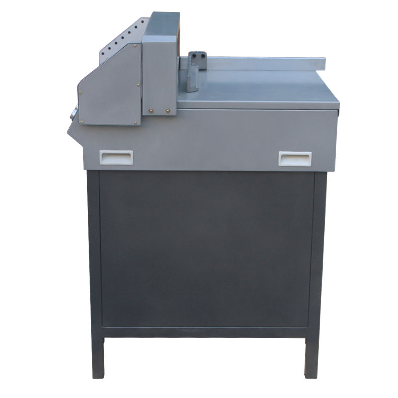 推入裁切纸张或书本,置于左边与标尺条靠齐,转动推纸手轮,调到需要裁切的尺寸,锁紧推纸螺母。